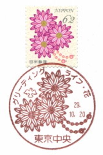 2017年10月20日発行・グリーティング切手・グリーティング(ライフ・花)に同日使用の絵入りハト印を東京中央郵便局で押印(会場は京橋郵便局内の記念押印会場)しました。 ・絵入りハト印/手押し:つまみ細工 [上から1、3枚目]つまみ細工2 ・絵入りハト印/押…