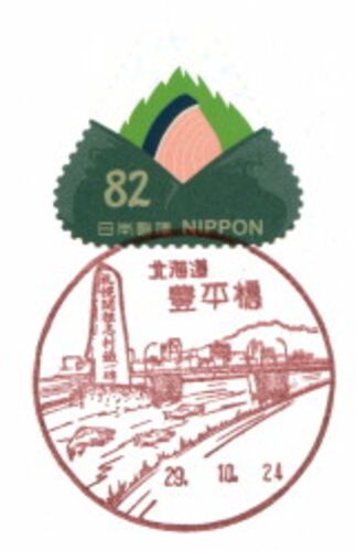 2017年10月24日、豊平橋郵便局に寄り、風景印を押印しました。 ◆豊平橋郵便局(とよひらばし) ・住所:〒062-0904北海道札幌市豊平区豊平4条2丁目6-12 ・図案説明:豊平川(サケ)、豊平橋、札幌開祖志村鐵一碑 ・使用開始日:1999年(平成11年)7月7日 ※使用切手…
