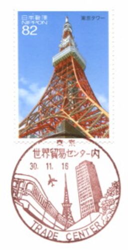 2018年11月16日(金)、「JAPEX2018」会場内の郵政ブースで集中押印していた「東京タワーと東京スカイツリーが描かれた風景印大集合!」の8局風景印のうち、世界貿易センター内郵便局風景印を押印しました。 ◆世界貿易センター内郵便局(せかいぼうえきせんたー…