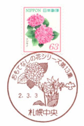 2020年3月3日発行・おもてなしの花シリーズ第13集に同日使用の絵入りハト印を札幌中央郵便局で集印しました。 ・絵入りハト印/手押し:アジサイ、カタクリ[上から1枚目]アジサイ、[上から2枚目]カタクリ ・絵入りハト印/押印機:タチバナ、サクラ[上から3…